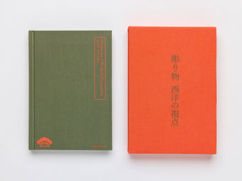 The traditional Japanese chūhon medium-size binding is wrapped in textured green canvas stamped with foiled lettering. The green represents the prolific pine tree symbol, which, combined with the vermillion slipcase, pays homage to the production of green and red sumi inks.