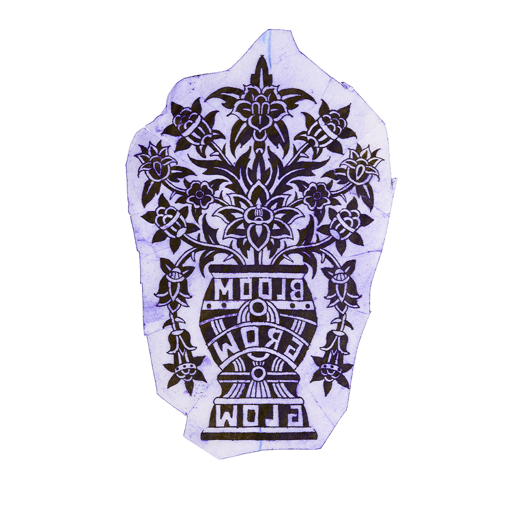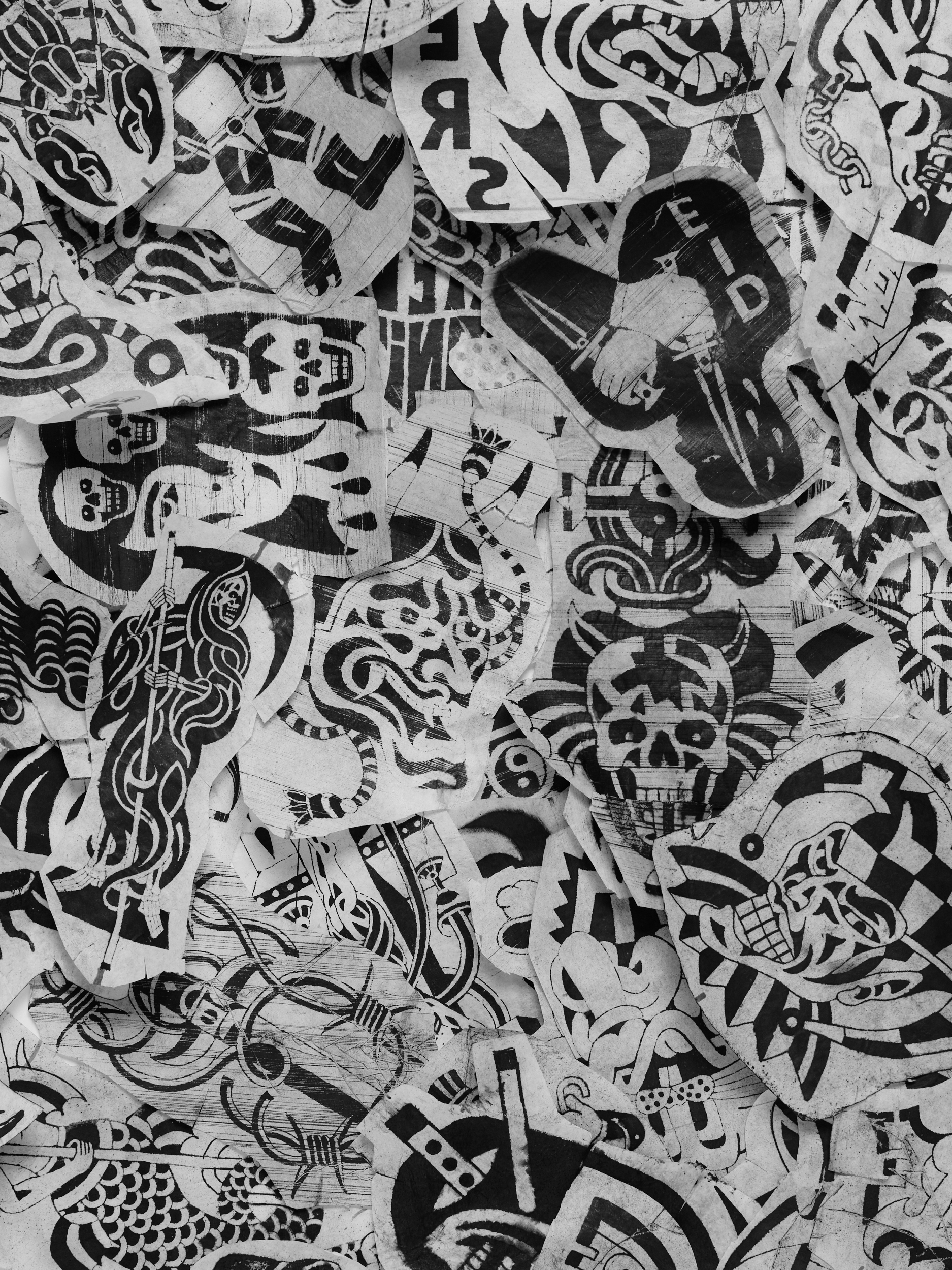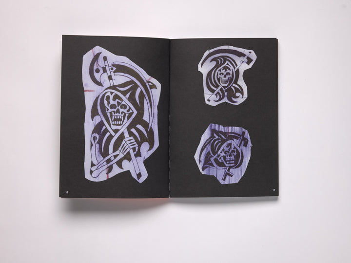At the heart of Bajo Mundo is an extensive archive of the stencils Luciano used to create real tattoos — the raw foundations of his practice. These designs are not theoretical studies or unused sketches; they are the living blueprints behind his body of work, revealing the structure, symbolism, and rhythm that define his style. Seeing these stencils collected together provides rare insight into how his visual language takes shape, and how his ideas move from concept to body.